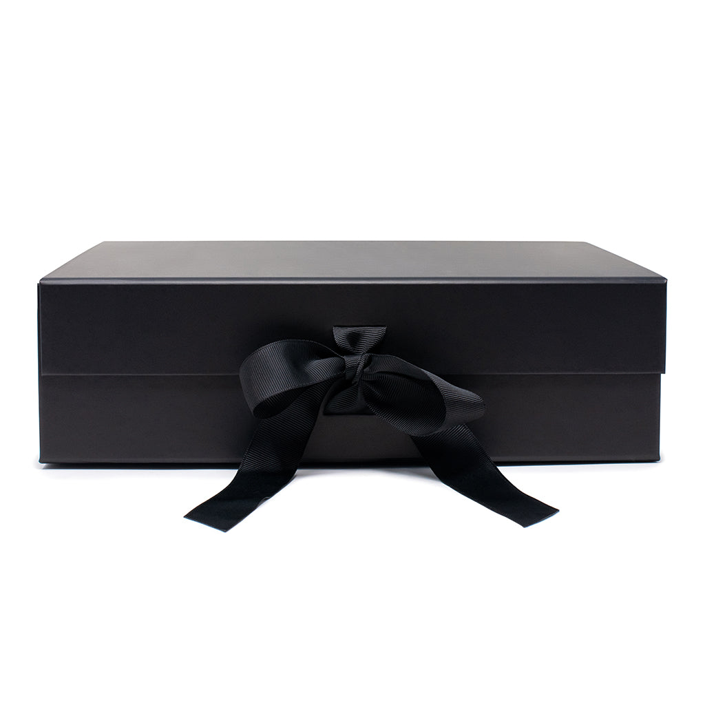 A sleek and easy to put together black gift box, for you to curate your own gift sets with. These boxes look great, use a magnetic snap-shut feature, and are finished with a black grosgrain ribbon.