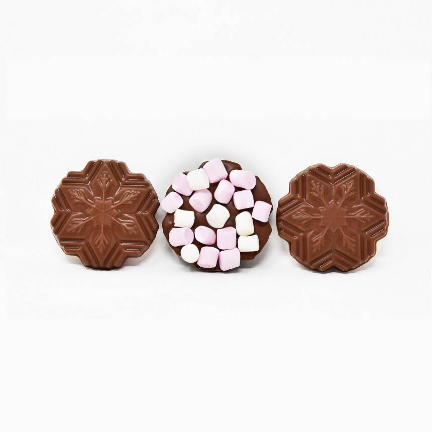 A trio of handmade milk chocolate snowflake melts, each topped with fluffy marshmallows to create a scrumptious hot chocolate when added to hot milk.