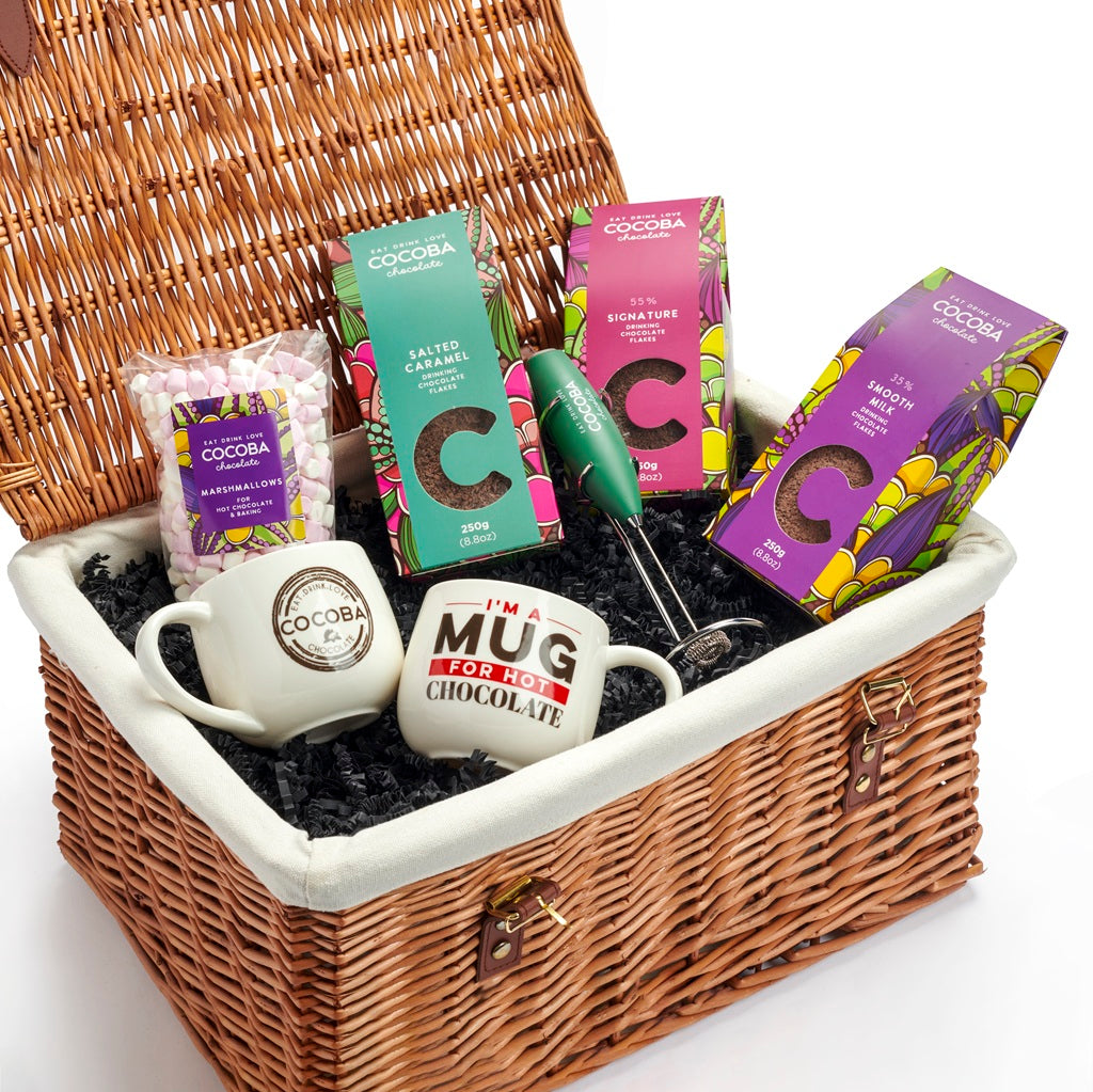 Indulge in the ultimate hot chocolate experience with our Luxury Hot Chocolate Flakes Gift Hamper. Beautifully presented in a wicker hamper filled with rich, hand-crafted chocolate flakes.