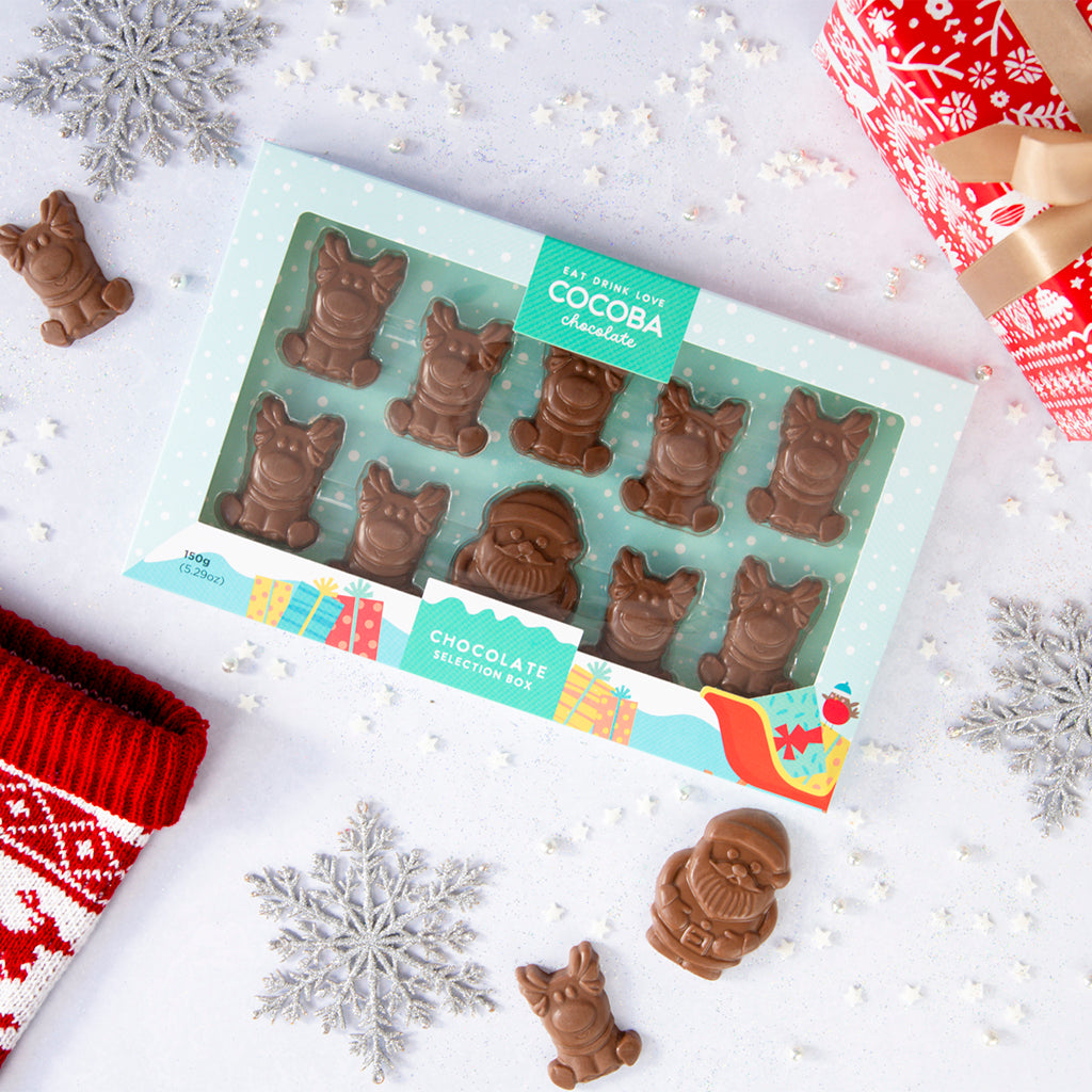 Spread some yuletide joy this Christmas with our Santa & His Reindeer Chocolate Bites! Each box includes a sweet collection of bite-size festive Christmas characters, made from milk chocolate in the shape of Santa and his trusty team of reindeer. Presented in a beautiful selection box, these cheery bites make a fun and loveable gift to bring out the kid in everyone this holiday season.