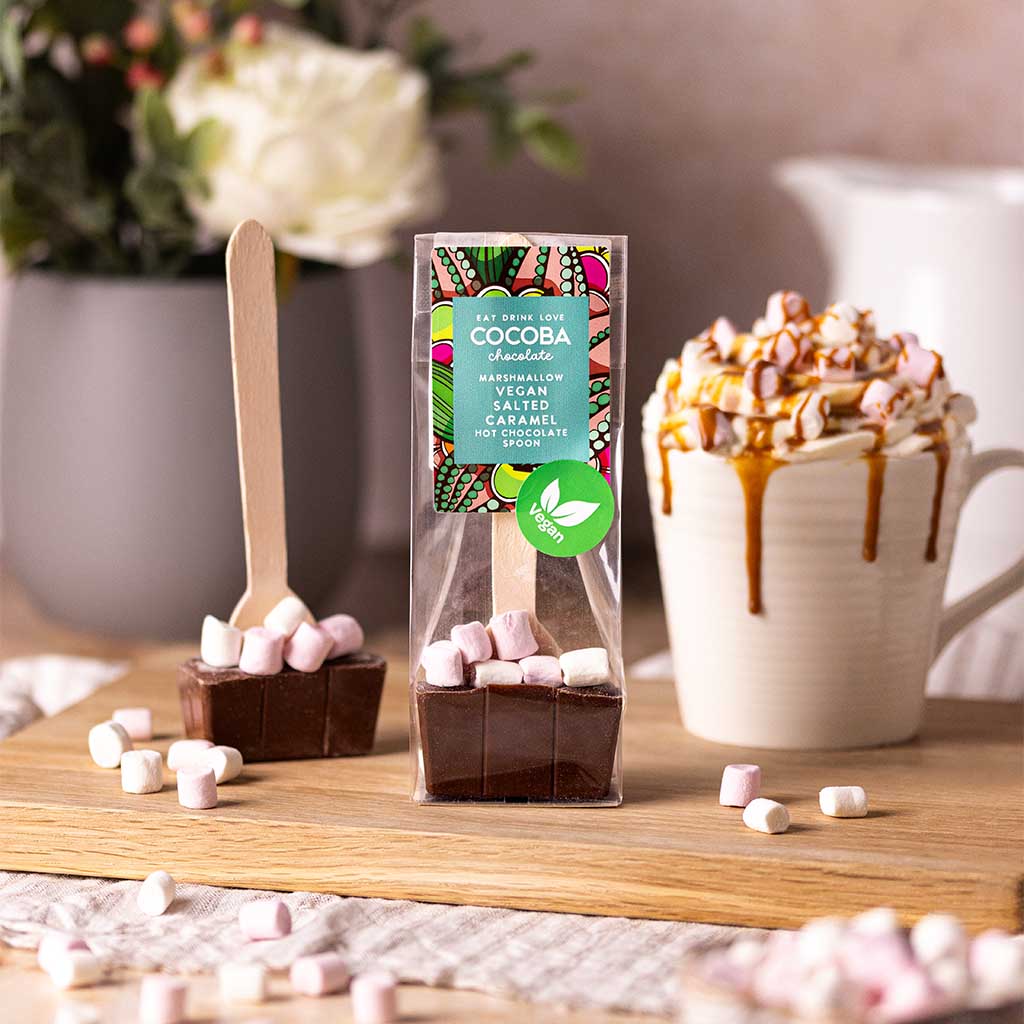 Savour the indulgence of our vegan-friendly alternative to milk chocolate, the allure of salted caramel, and the joy of vegan marshmallows all in one cup with our Vegan Salted Caramel Hot Chocolate Spoon. Complete with soft, pillowy marshmallows, each mouthful offers a divine combination of sweet and savoury flavours to elevate your hot chocolate experience.
